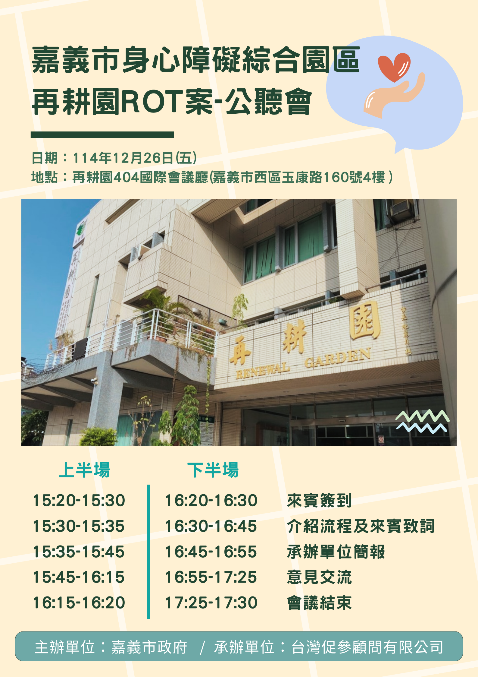 公聽會-114.12.26「嘉義市身心障礙綜合園區-再耕園ROT案公聽會」