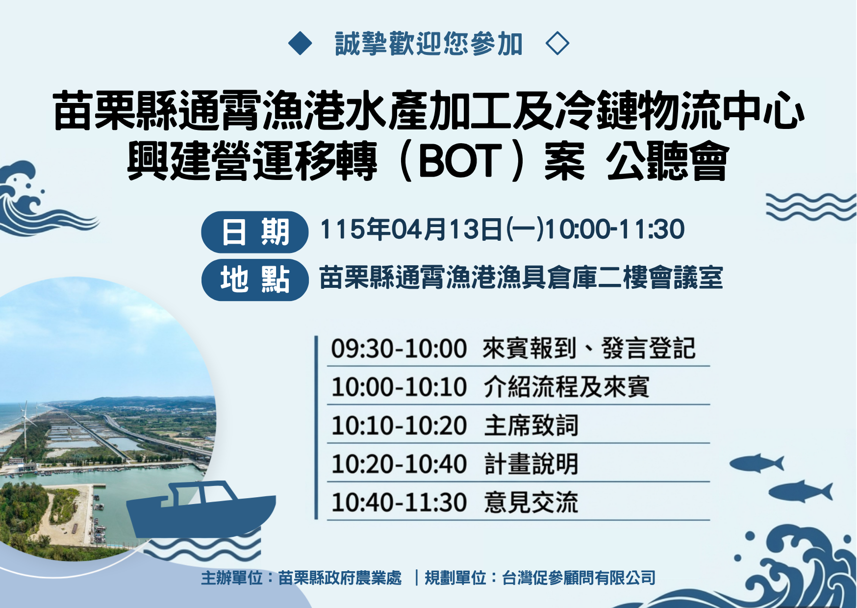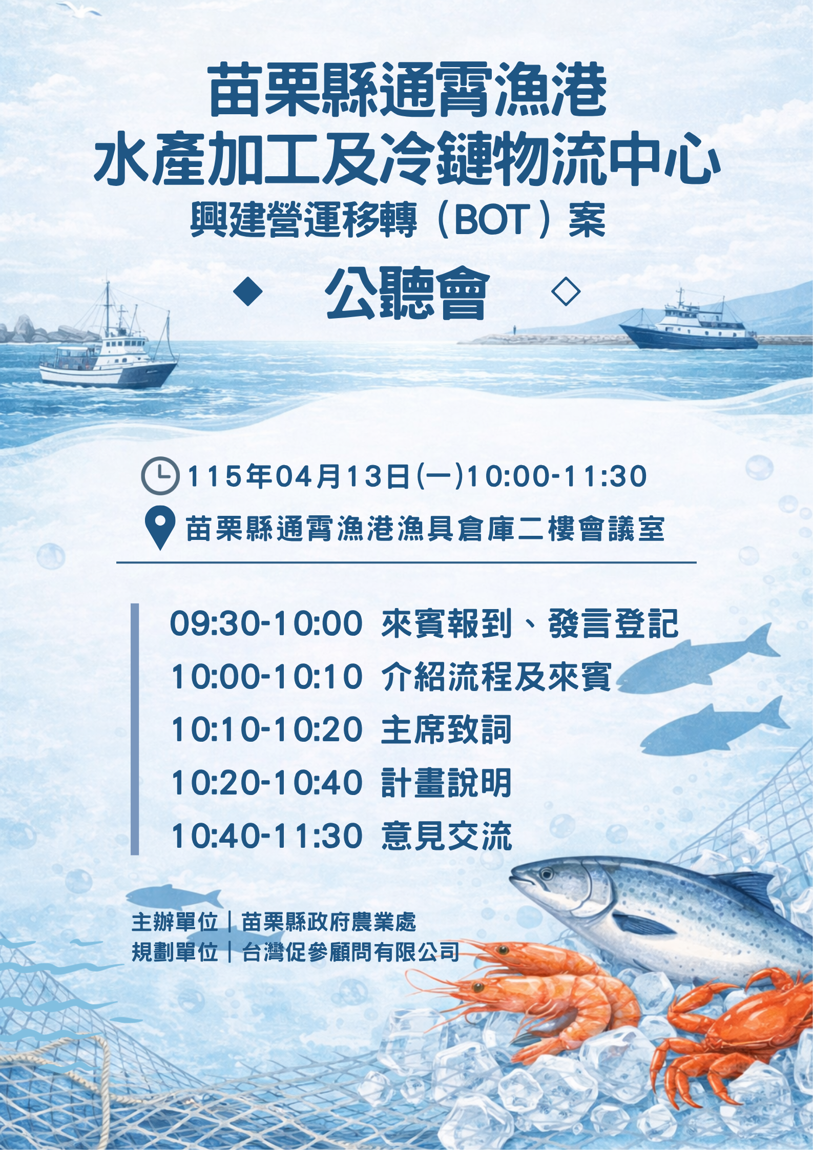 公聽會-115.04.13「苗栗縣通霄漁港水產加工及冷鏈物流中心興建營運移轉(BOT)案」